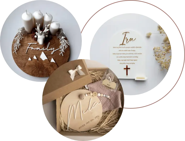 U početku smo stvarali proizvode za svakoga tko želi imati unikatan ukras u interijeru ili pokloniti personalizirani dar, a s vremenom smo proširili asortiman proizvoda. U ponudi imamo i božićne ukrase (vijence, kuglice…).